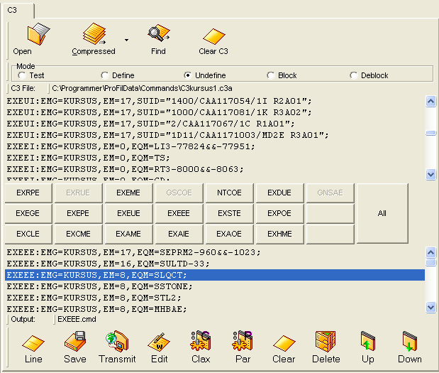 Press the buttons in the order you desire to build the output needed to do your task. If one or more C3-file lines are marked as a block, the manager works only with the marked commands. Marking is performed using the standard Windows® hotkeys (Shift or Ctrl + left mouse button), unmark using right mouse button. Generated commands can be deleted or moved up- or downwards in the output table as desired. Note that the powerful deblock mode can be used to reverse all Initiate commands to the corresponding End commands and adjust all parameters to match the new command format. Output can be saved to file, transferred to