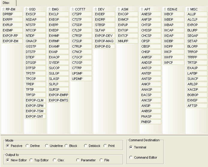 Never has regeneration of MML command printouts into Data Transcripts (DT) been easier. Just click on the command you want to regenerate. The corresponding print command is either transmitted or placed in the Command Editor. When the response printout has finished, Dtax automatically generates the DT and loads it into a new tab sheet Editor, Clax , Parameter Manager or the topmost Editor or saves it to a file. Five different layouts are available, and is selected from the Mode radio group. In Passive mode or when Transmit Manager is active, no DT generation takes place. By default the commands are sent with no- or ALL parameters. If you want to specify a reduced range, select Command Editor as your Destination and modify the command before transmission. Move the mouse over each command to see