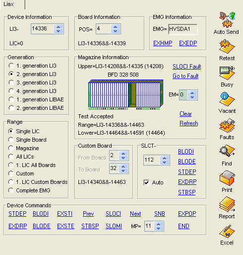 The Liax manager is designed to serve operation- and maintenance technicians working with faulty LIB-boards, and installation test technicians working with new EMG-EM’s. In "ToolBox", several tools are available to generate test commands (SLOCI or SLOMI) on basis of SLFAP or STBSP printouts. Sequences of unlimited length can be tested by input to SLOCI-tool, command responses can be examined and commands can be generated for repeated test of fault suspected devices. If you have a fault suspected device, you can enter the number to the edit field, and the manager will calculate it’s physical position depending of the LIC-type setting. (1 - 4 generation SDM / LSM plus 1 – 2 generation ISDN2 are supported) The calculated EM-number is valid, only if first device number of the EMG is a multiple of 2048, 1024 or 512, and the device numbers of the EM’s are consecutive. So it’s always a good idea to press the EXPOP-button to locate the magazine. Use the BLODI / BLODE-buttons to block and deblock all devices on selected board before and after replacement, and perform test of the new board by pressing the SLOCI-button. The EXSTI / EXSTE-buttons are for use when a board is appended or removed permanently, and EXDEP, EXRDP and STDEP-buttons are useful to watch the connection- and seizure state. The SLOMI-button performs a line measurement with program 11 as default. The Manager offers a wide range of information's about the actual magazine as well as the neighbor magazines. Holding the mouse over the magazine image, will open a hint balloon showing the ROF number. The manager inter-works with the terminal when sending SLOCI commands, turning fault free LIB boards green, and if one or more circuits are found faulty the color will reflect the test result. A small icon below each board will remember the test result color and show the fault codes in a hint balloon. A click on the icon will send a command for repeated test of the faulty circuits, and board / icon color will be updated according to the new test result. When all circuits are tested fault free, all icons must remain green. You can work with single LIC / LIB or multiple LIB's. SLOCI and SLOMI commands are placed as a DT on a new editor tab sheet, when working with multiple LIB's. Selecting All Boards, All LICs or 1. LIC All Boards will extend device sequence to range over all 128, 64 or 32 devices within the magazine. During transmission of a SLOCI DT, the board color is updated according to the test result. If you switch on the Auto Send button, commands are transmitted immediately, and otherwise commands are placed in the Command Editor for execution. Hold the mouse over any command button, to open a hint balloon showing the full command to be generated on click. If you select a LIB-board by a mouse click - the first device number of the board within the current magazine range is written in the edit field. You can in this way select by position, if the device number is unknown. A test Result report can be Printed or